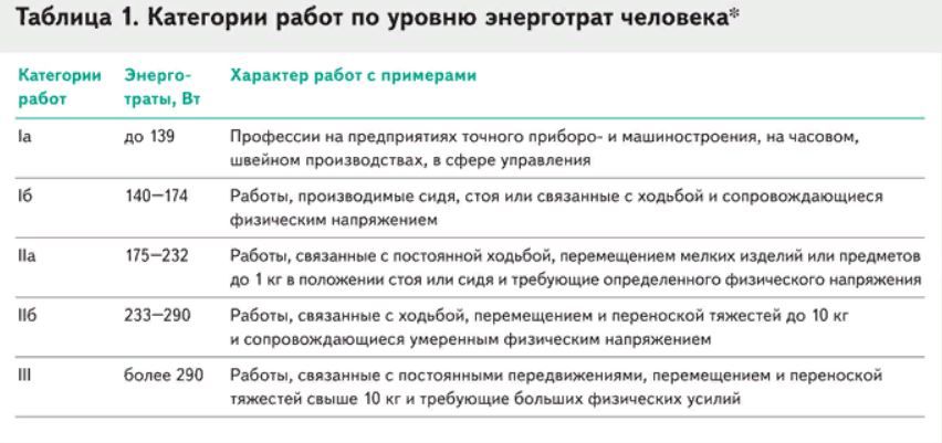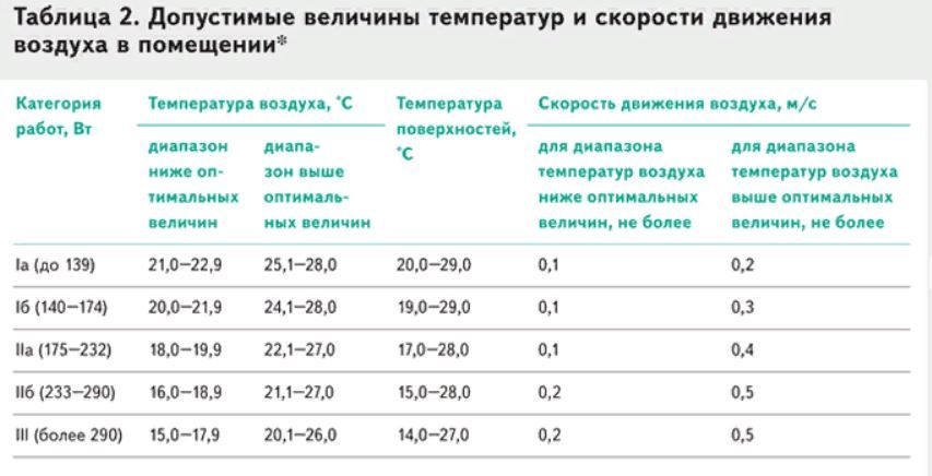 Чем больше энергии расходует работник во время работы, тем прохладнее должно быть в помещении. Поэтому нормативы температуры воздуха зависят от категории работы по уровню энерготрат человека. Например, у офисных работников энерготраты невысокие, для них оптимальная температура 22,9–25,1 °С, а допустимая — до 28 °С.