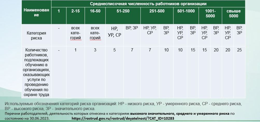 Информация о принадлежности к категории риска работодателям нужна, в том числе, для определения минимального количества работников, которых необходимо обучить по охране труда в обучающей организации.